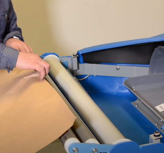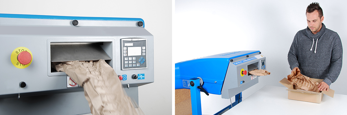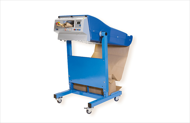 기계는 특허 받은 접이식 및 스티치 공정을 사용하여 종이를 보호되고 충격을 흡수하는 종이 패드로 만듭니다.