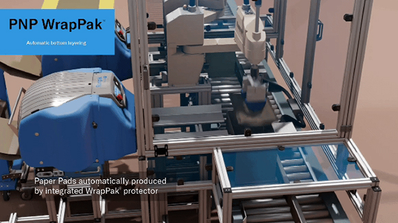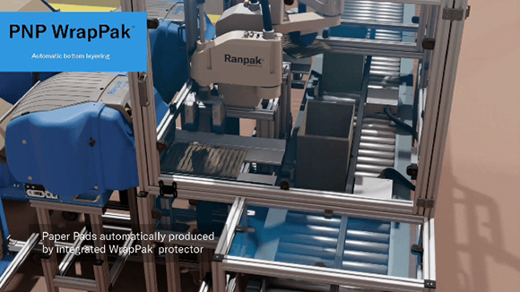 자동로봇암을 이용하여 박스 하부 및 상부에 자동으로 종이완충재 투입